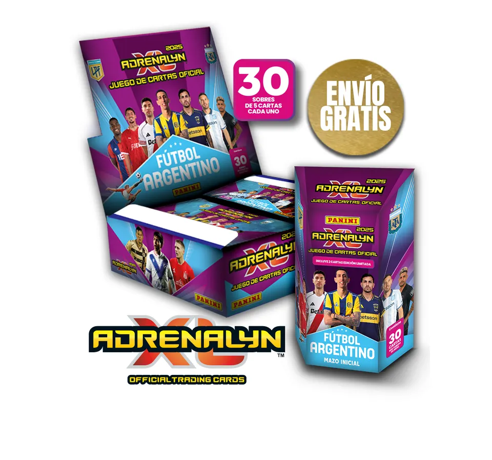 Pack completo de cartas Adrenalyn XL del Fútbol Argentino 2025. Incluye mazo inicial y 1 caja con 30 sobres.